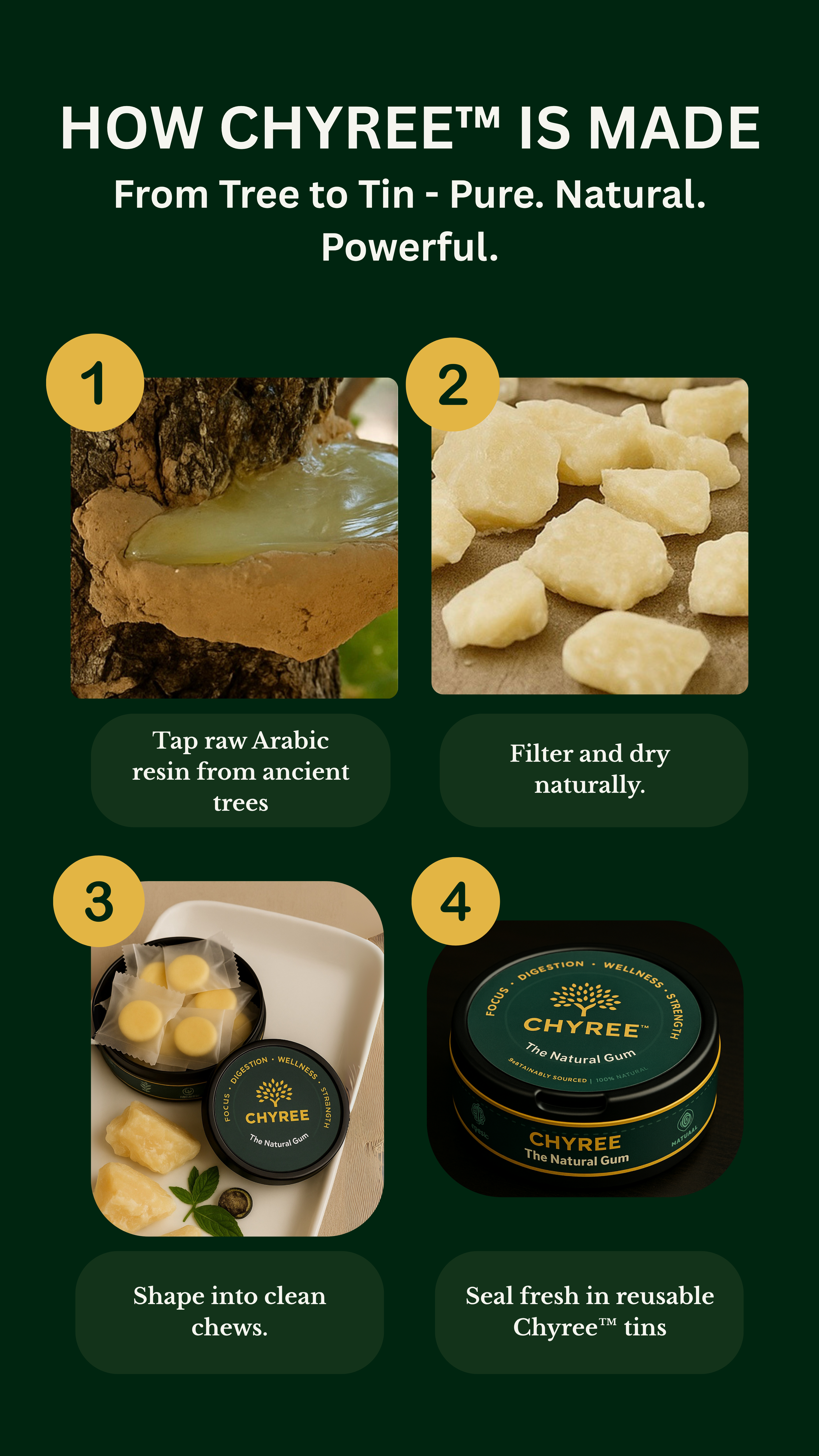 This Isn’t Gum. This Is Ritual. Stop chewing plastic, sweeteners and chemicals. Chyree is raw Arabic resin — hand-filtered, sun-dried, shaped by discipline not factories. Zero sugar. Zero plastic. Zero...